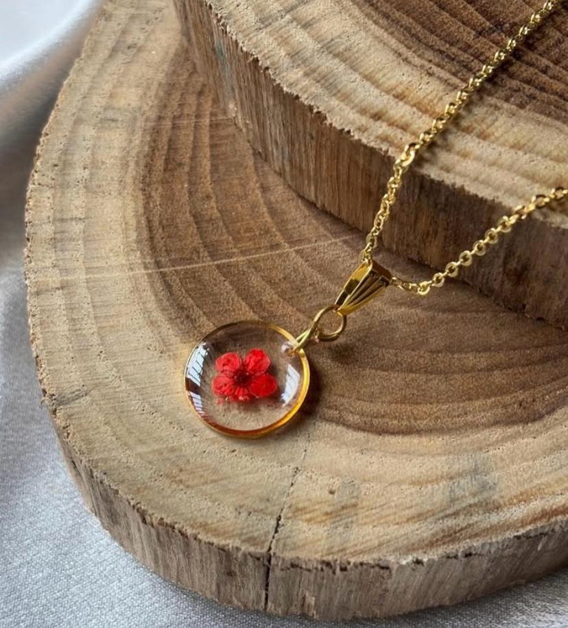Handcrafted Resin Pendant Necklace – Red Floral Design in Gold Frame
