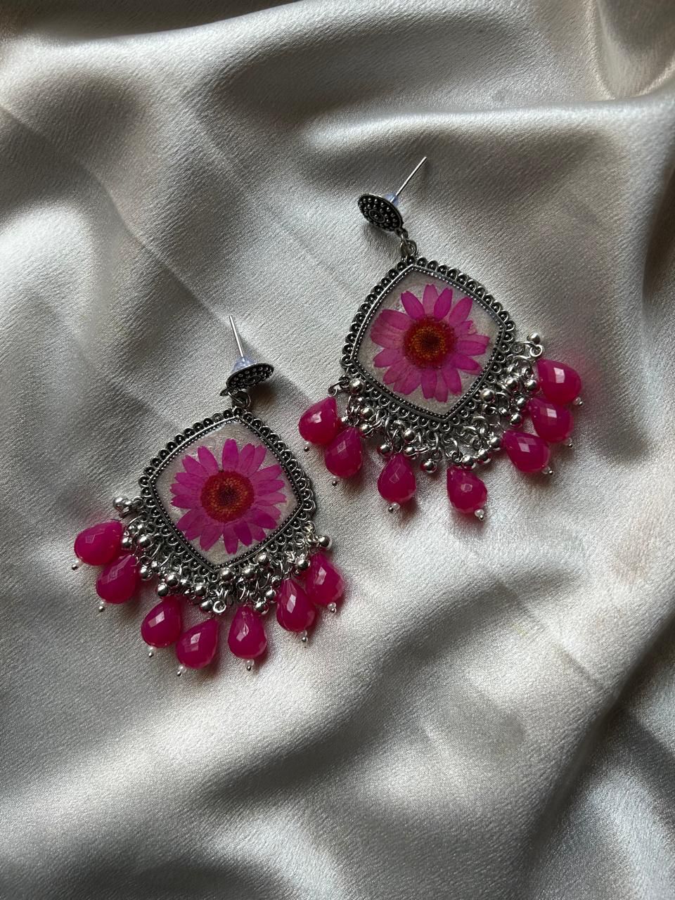 Handcrafted Resin Jhumka Earrings – Pink Floral Design with Beaded