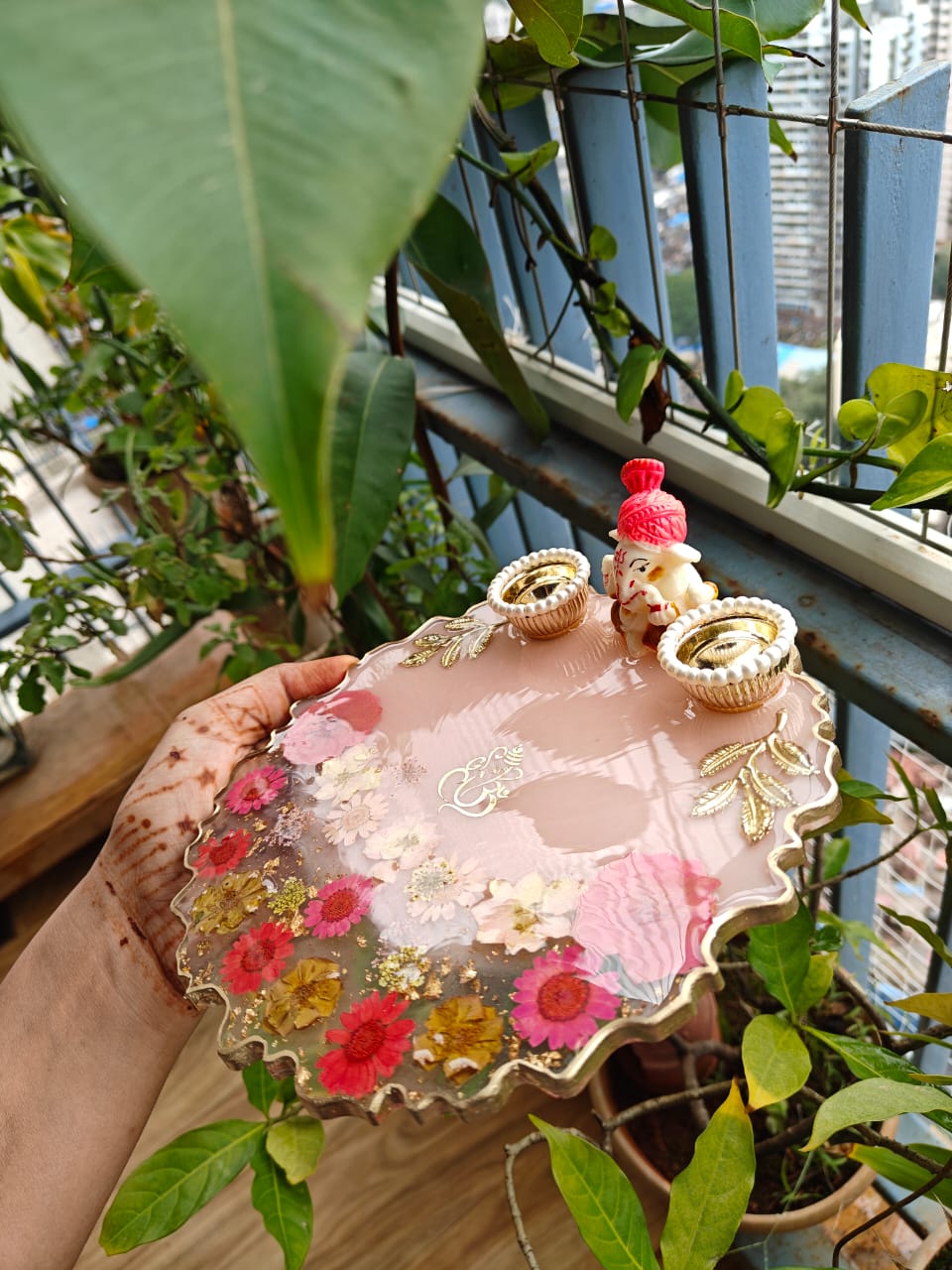 Handcrafted Resin Pooja Thali – Pink Floral Design with Lord Ganesha Idol