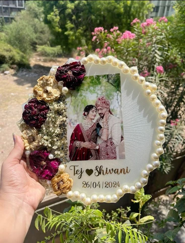 Celebrate your love story with this handcrafted Resin Varmala Preservation Frame, designed to preserve the most emotional moment of your wedding day. Featuring your varmala photo, embedded dried flowers, pearls, and personalized text, this frame is a timeless tribute to your bond.